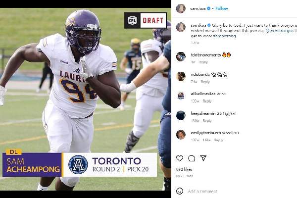 If you are a Canadian football fan, then you definitely know about Toronto Argonauts, a leading Canadian Football League (CFL) team established in 1873. According to the survey from January 2021, Toronto Argonauts was among the team with the biggest fan base. And Samuel "Sam" Acheampong is their newest addition to the team.